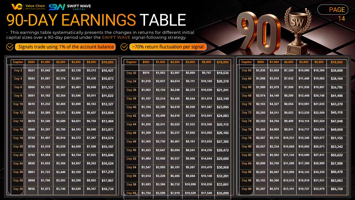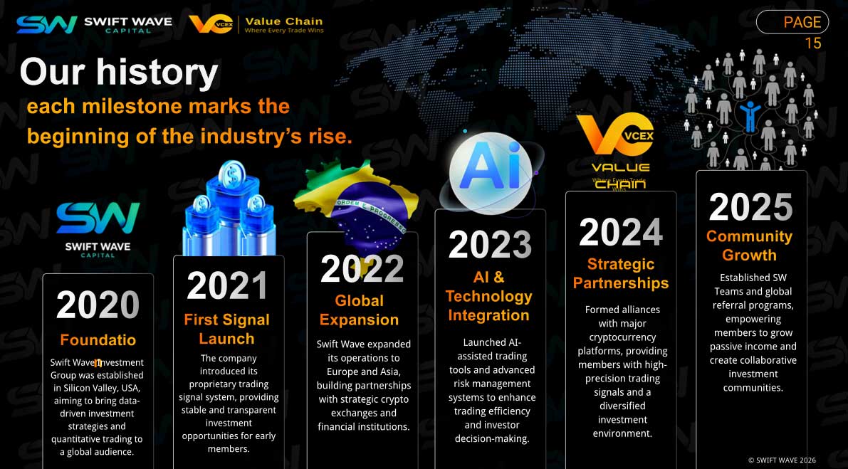 Founded in 2020, Swift Wave Investment Group originated in Silicon Valley, USA, and has grown within a global environment shaped by fintech innovation and quantitative trading principles. Since its establishment, Swift Wave has focused on trading strategy research, market signal generation, and the development of investment systems, serving investors at different levels worldwide. The team integrates Silicon Valley’s data-driven mindset, quantitative models, and hands-on experience across international financial markets, transforming complex market behavior into executable trading decisions. We adhere to a non-custodial, non-managed approach—never holding client funds or trading on behalf of users—empowering participants through a standardized signal system that ensures autonomous, secure, and transparent trading.